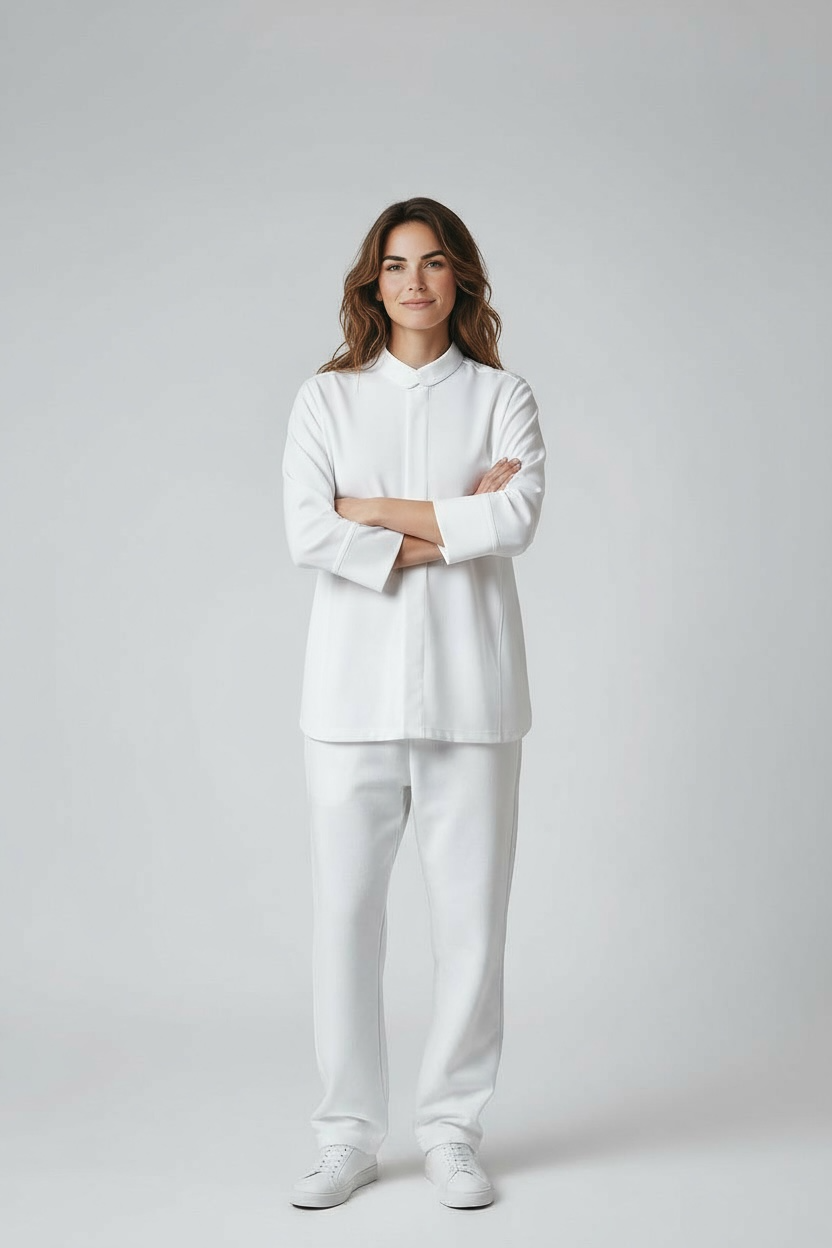 Bebe yaka tasarım: Klasik şef ceketlerine modern bir yorum katar, boyun bölgesinde ekstra rahatlık sağlar.